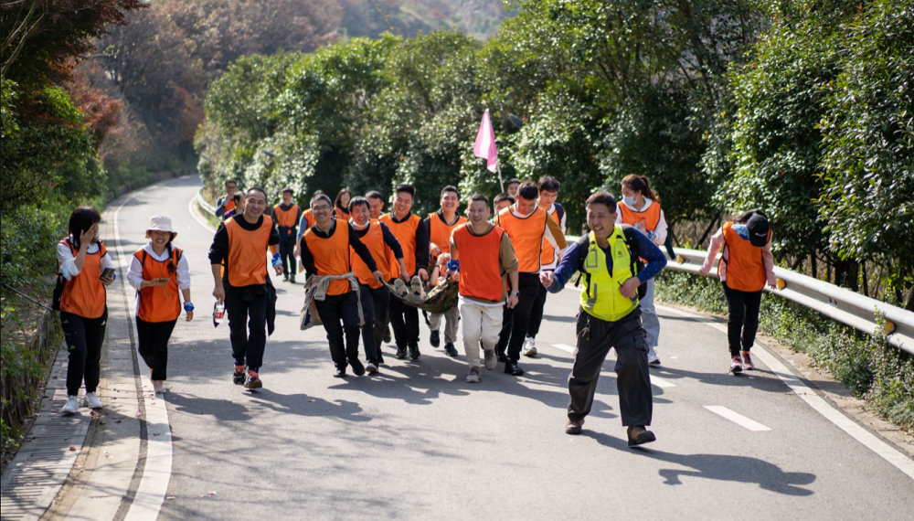 在活動開始前,大家被隨機分為紅、橙、藍、紫四支隊伍,在大陽山上攀登,梭在翠綠樹叢山間,仿若一條綻放七彩的巨龍,以大陽山為起點,開啟了我們的七周年慶團建活動。在隊長的帶領(lǐng)下,我們走走停停,談笑風(fēng)生,顧不得腰酸腿軟,汗流滿面,日常缺乏鍛煉的小伙伴們,到了差不多一半的時候坐下就不想起來了,還說下去的時候希望能一下子滾到山腳下,不過在大家互相互相關(guān)照互相鼓勵下,還是共同攻克爬山途中穿插的考驗項目,成功地翻越大陽山,抵達留白館,也正是我們的午飯地點,爬山耗費了諸多體力的我們可以在這環(huán)境優(yōu)美的地方享受美食,真是一大樂事!